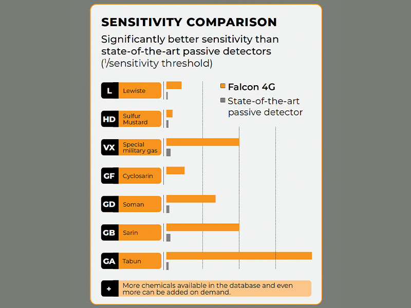 Falcon 4G is a 4th generation active stand-off detector based on eye-safe and undetectable laser technology that can detect, identify and quantify Chemical Warfare Agents (CWA) and Toxic Industrial Chemicals (TICs) at long distances up to 6 km.